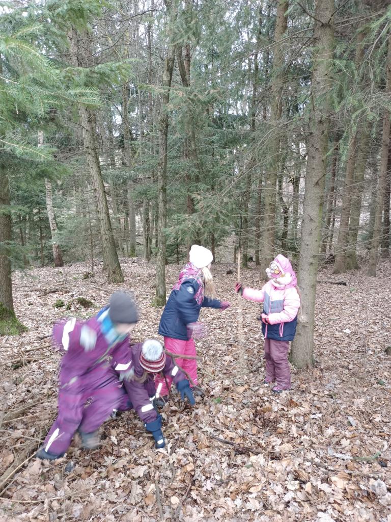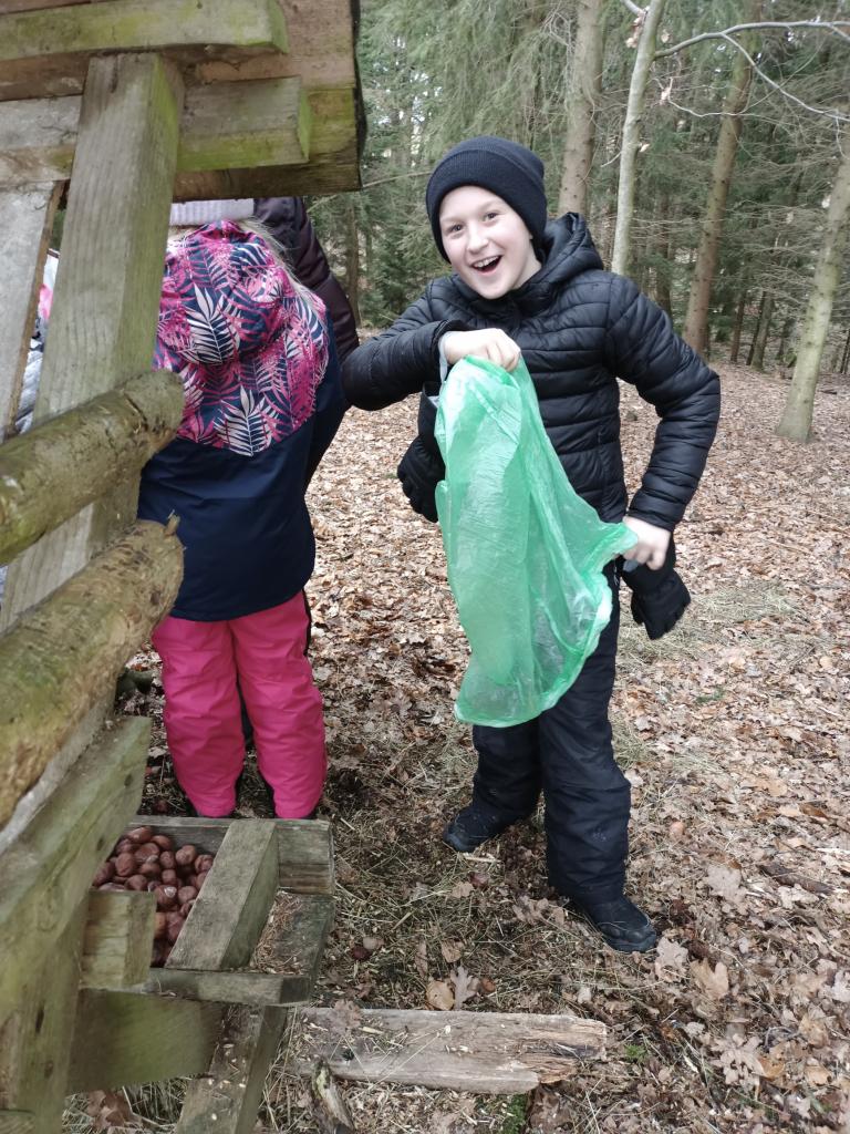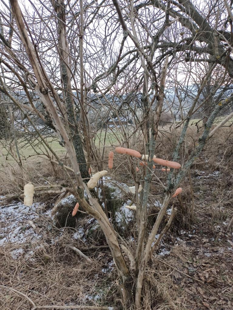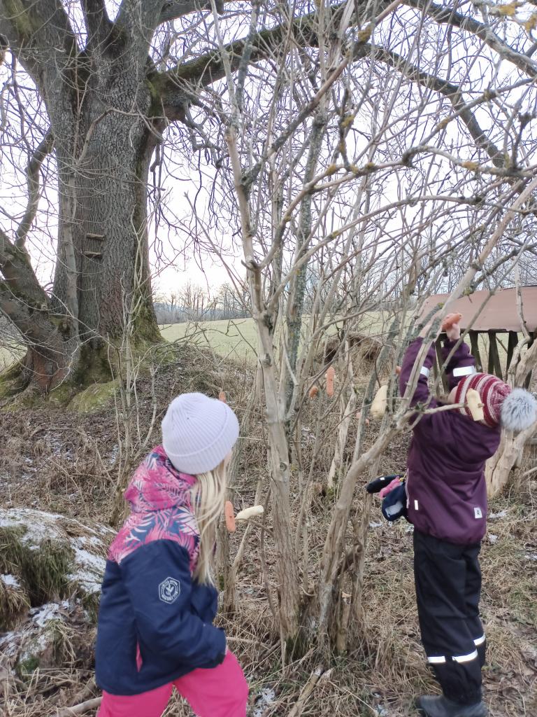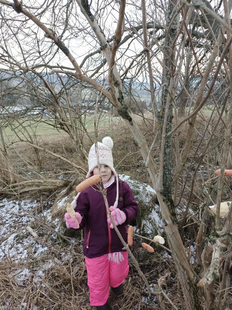 Každoročně chodíme krmit zvířata do nedalekého krmelce u jasanu. Letos jsem s dětmi ozdobila stromek zeleninou. Do kořenové zeleniny jsme provrtali otvory, které jsme následně navlékali na větvičky. Zbytek zeleniny dostala zvířata do krmelce.
