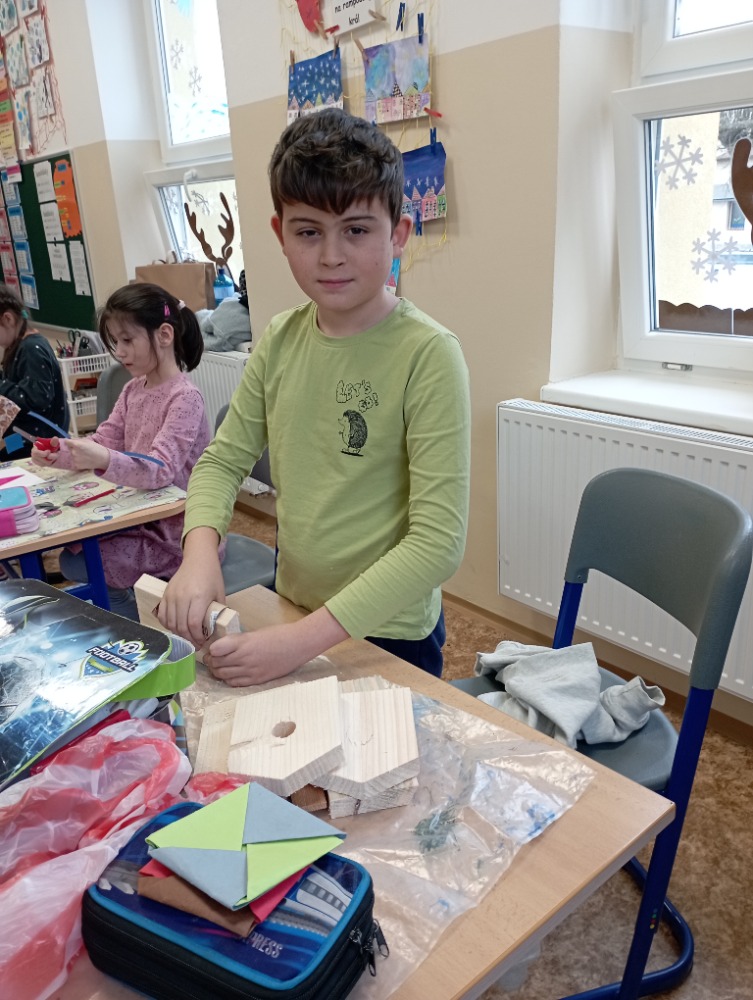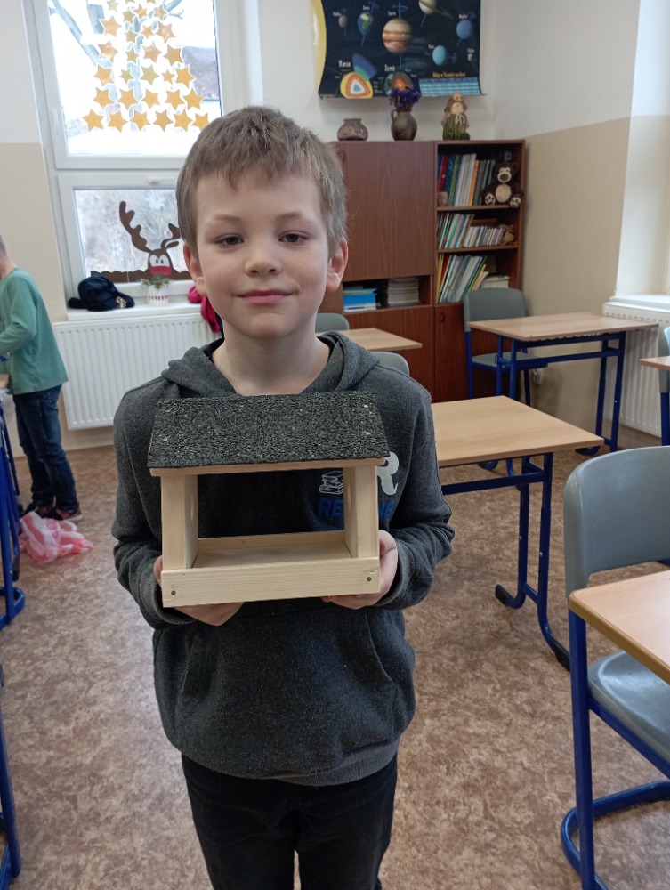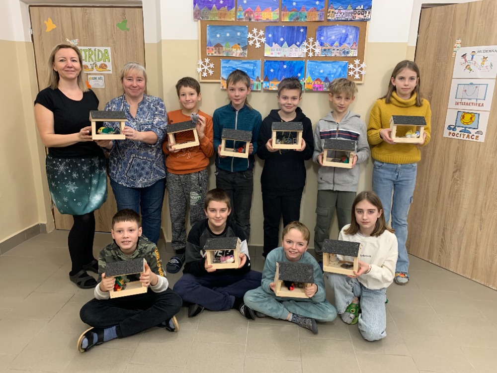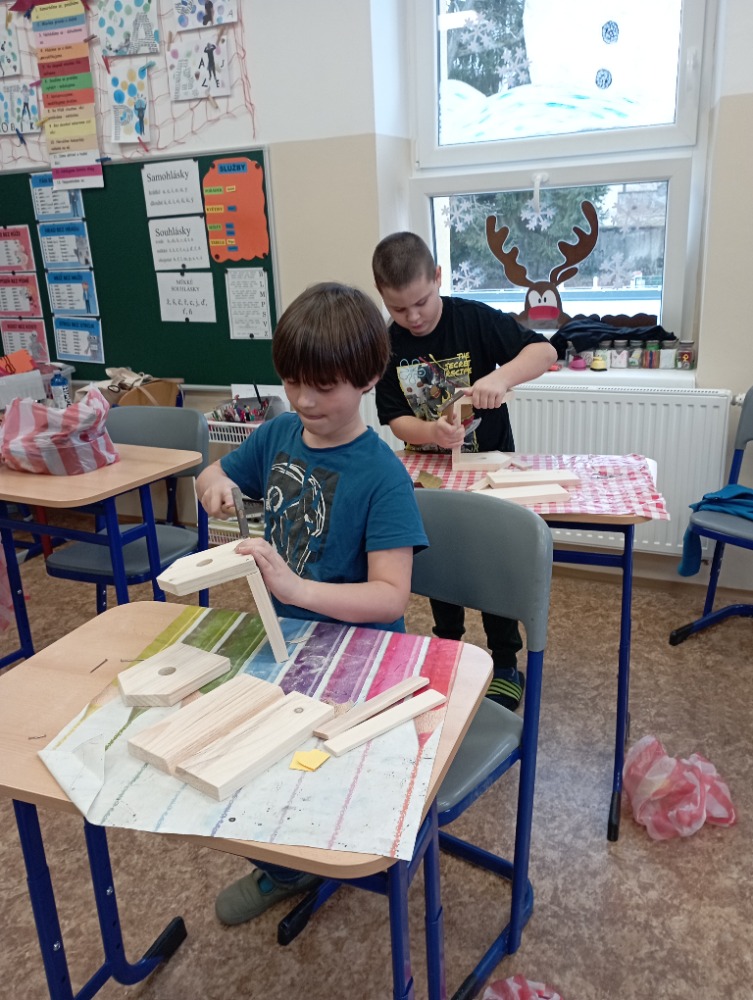Žáci si pod vedením šikovných učitelek vlastnoručně vyrobili krmítko pro ptáčky. Jednotlivé díly dřevěného polotovaru si každý žáček opracoval smirkovým papírem, větší části stloukli hřebíky.