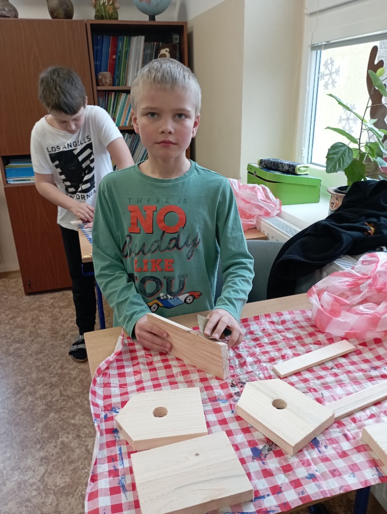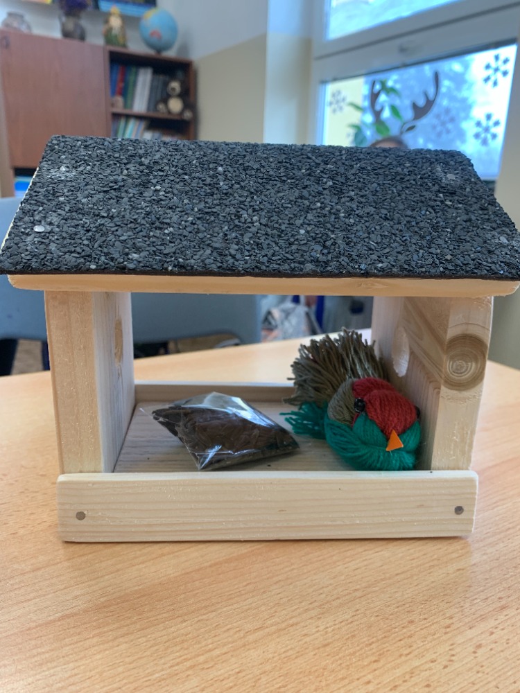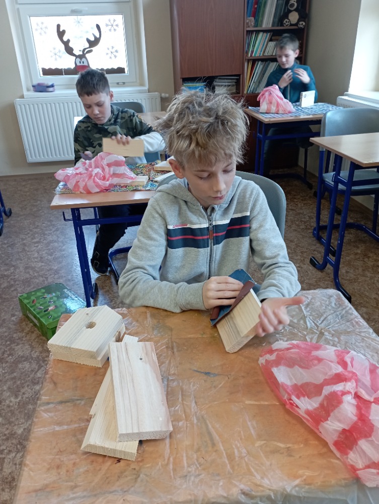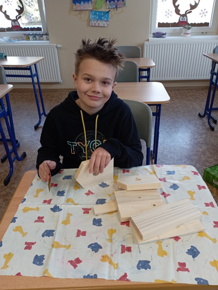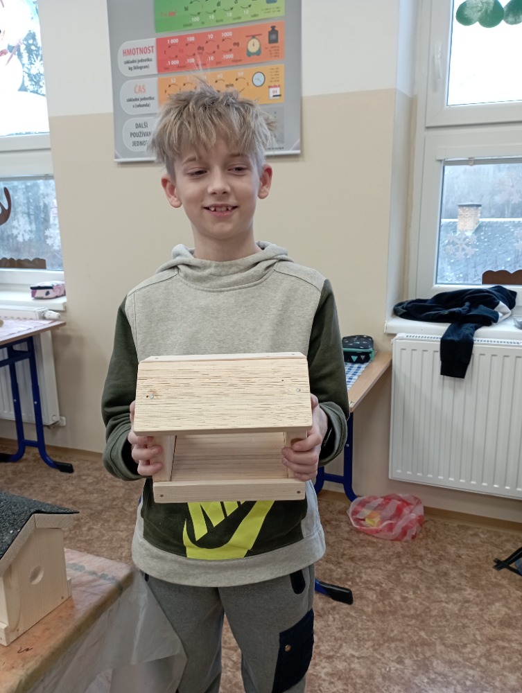 Žáci si pod vedením šikovných učitelek vlastnoručně vyrobili krmítko pro ptáčky. Jednotlivé díly dřevěného polotovaru si každý žáček opracoval smirkovým papírem, větší části stloukli hřebíky.